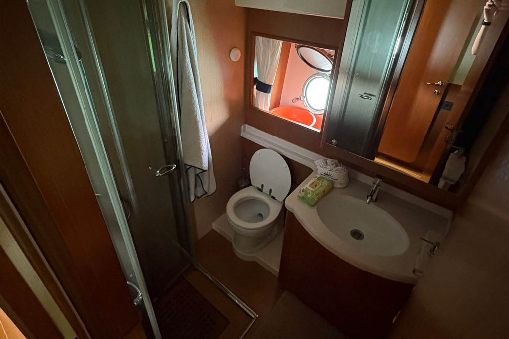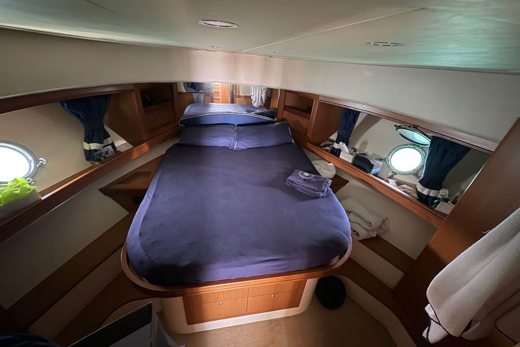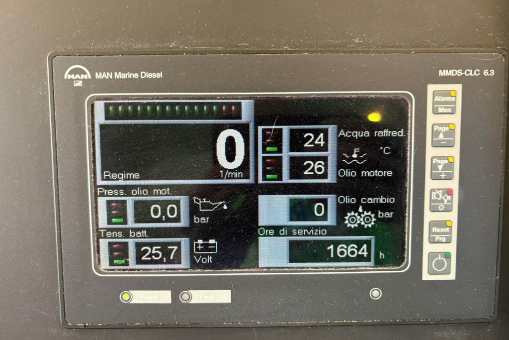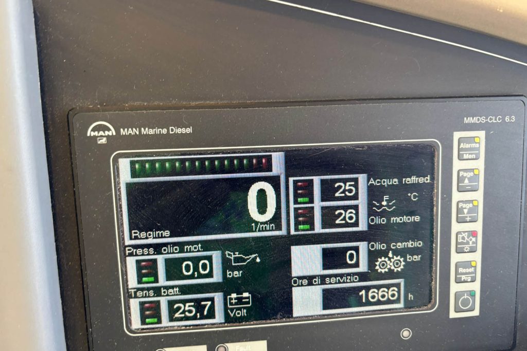 Splendida navetta dei cantieri sorrentini Aprea .Condizioni eccellenti, pronta alla boa con consegna immediata. La tuga è fornita di ampie vetrate che si aprono verticalmente ed il ponte principale ospita a prua un comodo prendisole, mentre il flybridge accoglie un secondo prendisole ed un angolo dinette, con divano e tavolo. L’accesso da poppa all’area interna avviene tramite una porta a vetri scorrevoli. La zona living si compone di un divano ad L sulla murata di dritta con un tavolo e di un altro divano lungo la murata di sinistra. La motorizzazione installata a bordo prevede due motori MAN mod. D 2876 LE 405 con trasmissione V-drive della potenza di 730 CV ciascuno, per una velocità massima di circa 30 nodi.